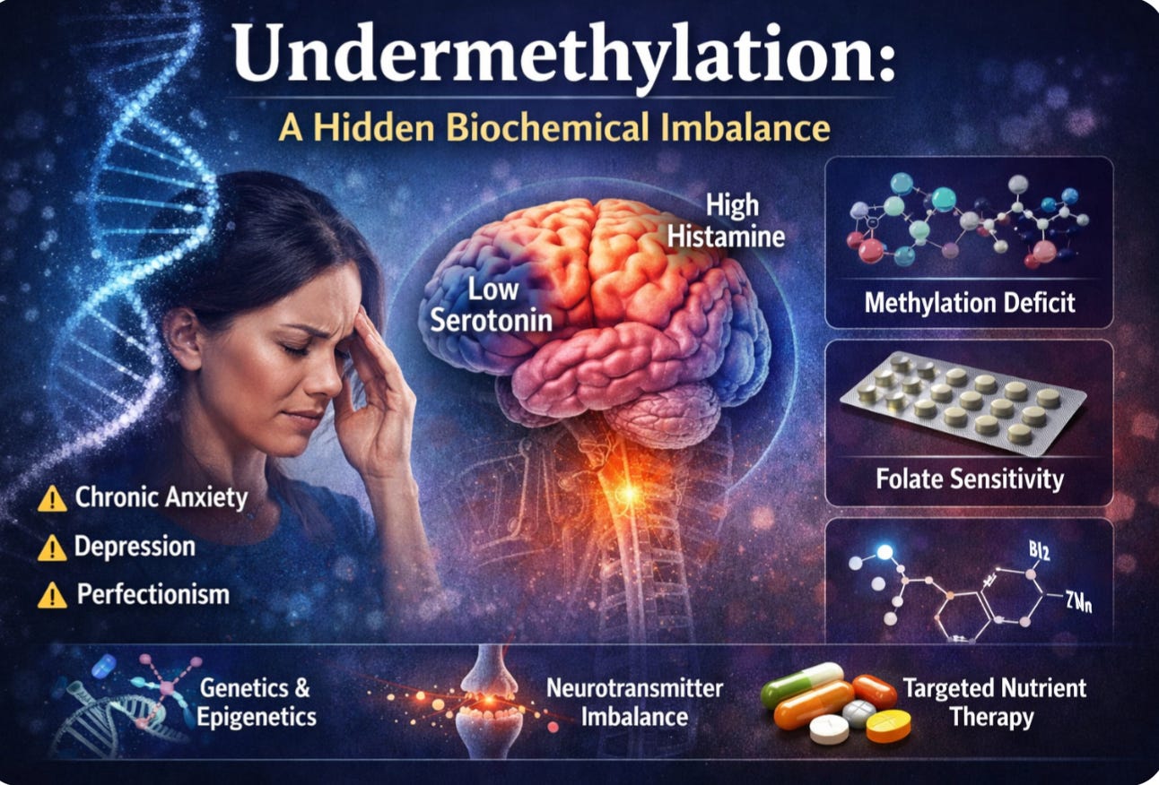 Undermethylation may be one of the most misunderstood biochemical patterns in modern psychiatry. On the surface, it can resemble classic depression, high-functioning anxiety, obsessive thinking, perfectionism, or chronic inner tension. Many individuals appear disciplined, driven, and mentally sharp — yet internally they struggle with persistent low mood, rumination, seasonal worsening, and a sense of emotional constriction.